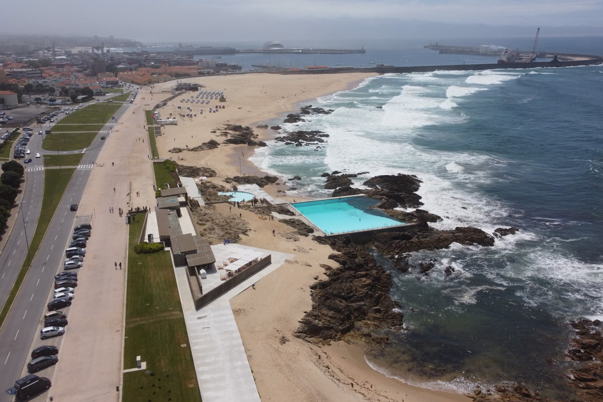 Initially marked by the existence of a lobster vivarium, this place maintains a dialogue between natural elements and artificial information. The several straight parallel walls in reinforced concrete, that are “cut” at the bar area by a plan that points to the crane or “titan”, contrast with the nature of rocks and the sand. So then a path appears, that is slow and that alternates between being either parallel to being perpendicular to the sea, descending, partially buried to free up the view of the horizon to whoever is circulating in the road. The high walls postpone the discovery of the sea, giving access to cloakrooms, showers and toilets, bar and also the water treatment station that belongs to the sea. The walls in reinforced concrete support the wooden and copper roof where the partitions are suspended. If we go down and peek, we can grasp the continuous pavement, free as the sea. (Inês Moreira and João Paulo Rapagão, OHP’18)